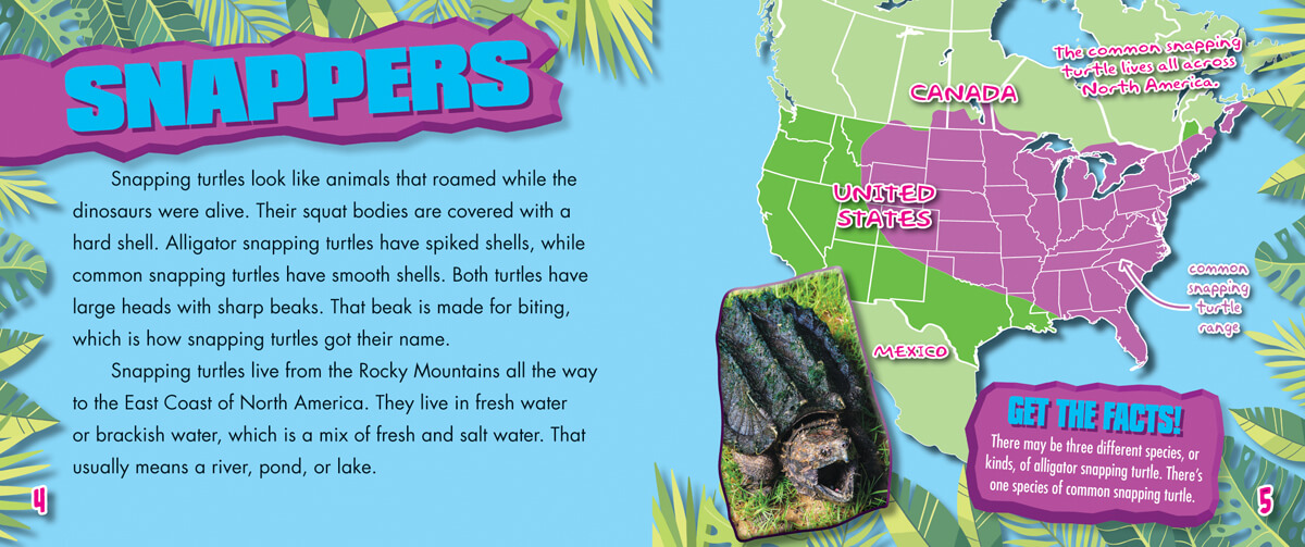Unlike many other creatures, snapping turtles aren't very picky when it comes to their food. They're usually happy to eat almost anything they can get their mouths on! Readers of this innovative volume are introduced to these often-aggressive animals and learn key facts about them, such as the differences between the common snapping turtle and the alligator snapping turtle. Eye-catching photographs correlate closely with engaging text, supporting a solid understanding of this narrative's scientific and curricular content.
