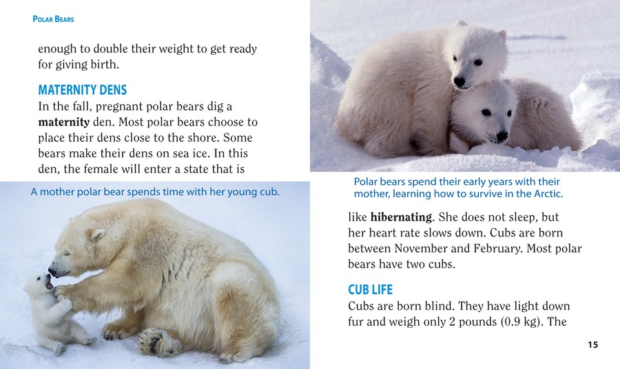 Polar bears are one of the Arctic's most fearsome predators and one of its most endangered animals. Their huge size, blubber, and thick fur allow them to survive in their cold environment, while their sharp sense of smell means they can sniff out their dinner from a long distance. Full of vibrant photographs and fun facts, this simple narrative examines how the polar bear's life cycle, body structure, and behaviors have adapted to its challenging environment and shrinking habitat. A final activity asks readers to use what they've learned about polar bears to create an Arctic food web.