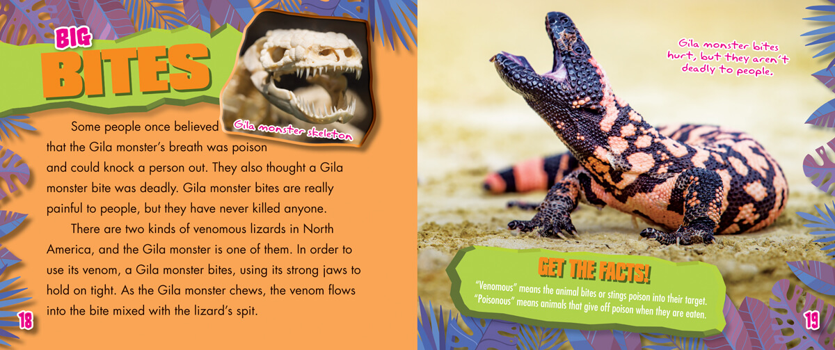 These creatures might not be the first image that comes to mind when one hears the word "monster," but a Gila monster's bite can be deadly to its prey. While this reptile moves slowly, it is able to protect itself from predators in a fascinating way. Accessible text conveys important aspects of elementary science curricula while eye-catching photographs keep readers of many ages and levels engaged. Curious and developing readers will be thrilled to recite the many fun facts they learn from this volume.