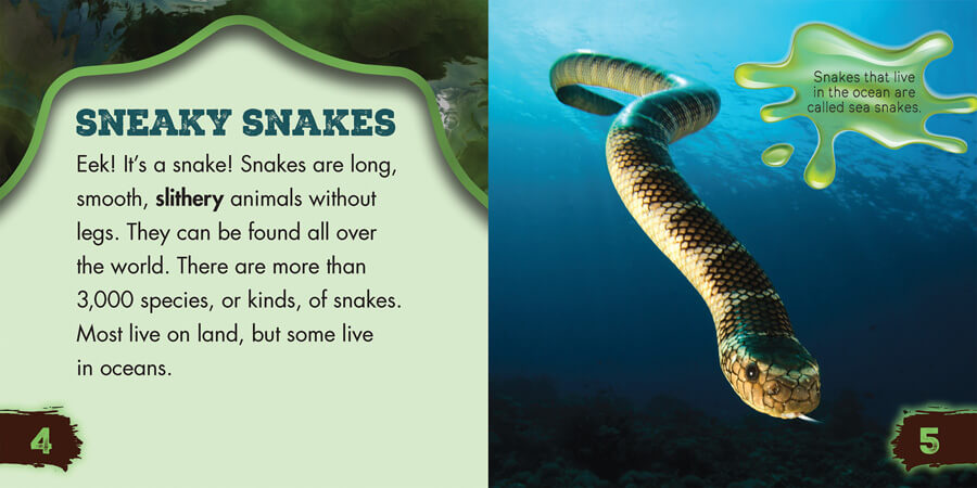 Have you ever spied a slithering snake? Cold-blooded, covered in scales, often venomous, these creepy reptiles have thrilled and intrigued people for centuries. In this fun, fact-filled book, young readers will learn all about snakes! They'll find out about the many varieties of snake species that live around the world. They'll discover what snakes' unique adaptations are and how these adaptations have helped snakes survive. Readers will learn why snakes slither, where they live, what they eat, and more. The high-interest material is paired with vibrant photographs, which bring the information to life.